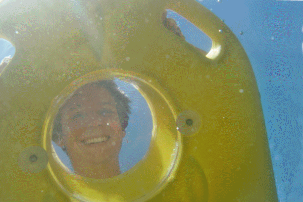 VELOSUB is riden laid frontside. It is faster and more snorkelling oriented. Put your feet on the pedals, catch the handles on the forward float, and go! As soon as you start to pedal you immediately take speed. A mere move of your hand on one side or inclination of the body easily stear.